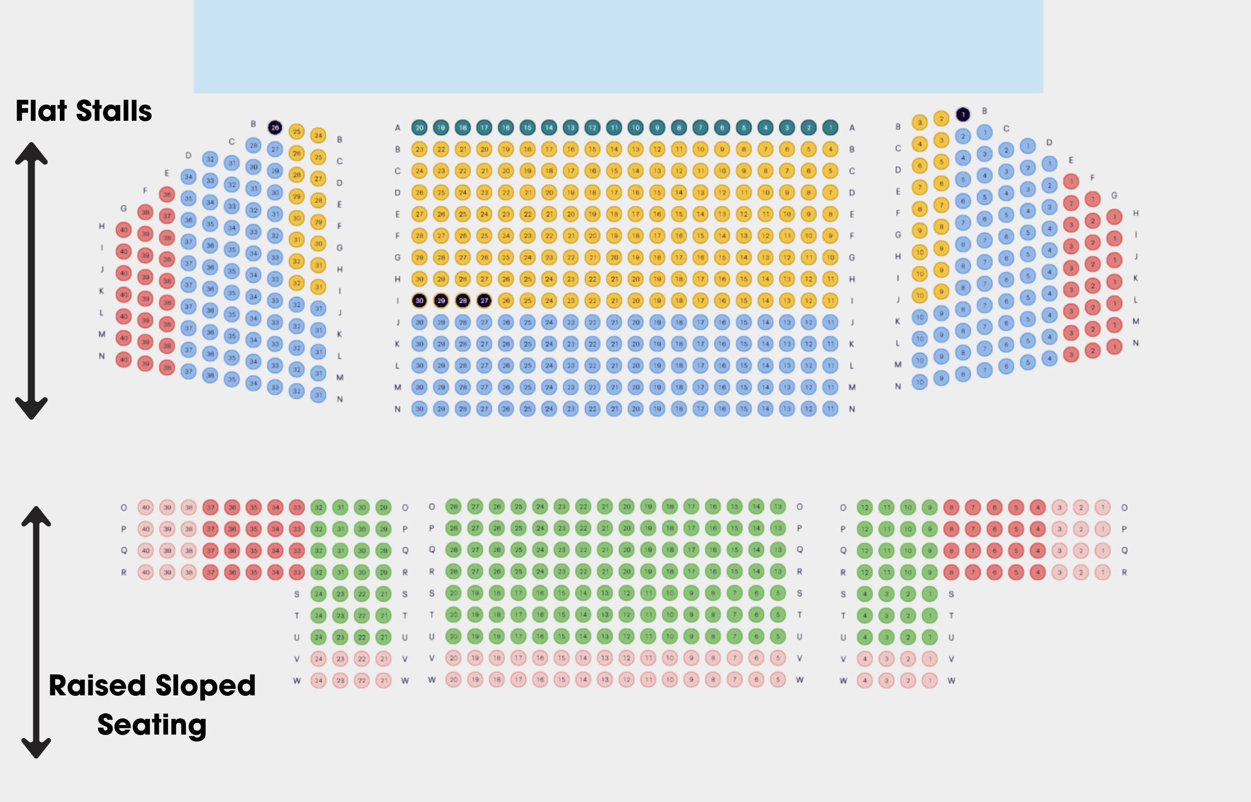 Seats on the end of a row in the flat stalls can be removed for wheelchair users. Rows A to N are all flat seating. Please contact hello@brightonfamilypanto.com for more help.